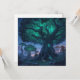 Un arbre ancien massif brille d'une lumière verte au cœur d'une forêt crépusculaire.