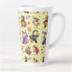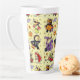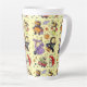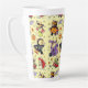 Une tasse de latte décorée avec des illustrations festives d'Halloween, comme des citrouilles souriantes, des fantômes et des chauves-souris. Le café est recouvert d'une mousse crémeuse, avec un léger saupoudrage de chocolat en forme de toile d'araignée. Parfaite pour savourer une boisson réconfortante lors des soirées d'automne !