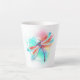 Rouge, volant, artistiquement dessiné, dans des couleurs vives avec texturé iridescente, ailes bleues sur l'arrière - plan blanc, peint avec des éclaboussures de peinture aquarelle. libellule rouge vif.
