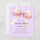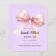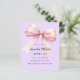 Arrière - plan de lavande douce, violette, décorée d'un grand arc rose. Personnalisez et ajoutez un nom et des détails du parti. 1 feuille = 1 invite imprimé bord à bord.