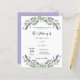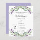 Un arrière - plan blanc décoré de fleurs de lavande et de verdure d'eucalyptus. Personnalisez et vos noms et détails. Retour : lavande, arrière - plan violet. 1 feuille = 1 invite imprimé bord à bord.