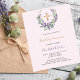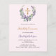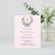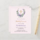 Arrière - plan rose. Une couronne fleurie faite de fleurs de lavande, une verdure d'eucalyptus aquarellée et une croix dorée. Personnalisez et ajoutez un nom et des détails. 1 feuille = 1 invite imprimé bord à bord.