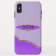Coque élégant avec un détail en diagonale lilas, bordé d'une fine ligne dorée et d'une étiquette lilas dorée sur rayures de lavande arrière - plan. Personnalisez-le en ajoutant votre propre nom, en modifiant le style de police, la taille de police et la couleur de police comme vous le souhaitez.