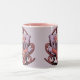 This mug features a stylized art nouveau illustration of a woman in a meditation pose centered within an ornate decorative frame. The woman wears a burgundy long-sleeved top and flowing red pants, sitting cross-legged on a plush lavender tufted chair. Their hands are pressed together in a prayer position at chest level, and their eyes are closed in a peaceful expression. Her hair is styled in a 1920s fashion with curls. The text GRATITUDE appears in large, stylized lavender letters across the woman's lap. The decorative frame features elaborate red Art Nouveau-style swirls and curves, with a large circular arch element at the top. The background is a solid lavender color. This lavender image is on both sides of the mug. The mug is a pink two tone mug. The mug has a pink glaze interior.