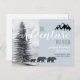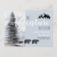 L'aventure vous attend, les bois rustiques ours faire-part de naissance dans des teintes douces pastel gris bleu, avec un majestueux pin forestier et une silhouette montagneuse. Type de lettrage manuel mignon contrasté avec un type de script moderne tendance.