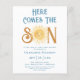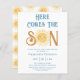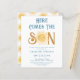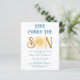 Famille Invitation et amis à votre baby shower sur le thème du soleil avec cette invitation baby shower garçons budget. Il présente le texte "Here Comes The Son" en typographie rétro bleue avec un joli soleil d'aquarelle jaune. Le dos est décoré d'un motif souriant. Facile à personnaliser. Aquarelle originale © Michele Davies.