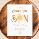 Le carte de remerciements de baby shower de ce garçon à budget présente le texte "Here Comes The Son" dans une typographie brune élégante avec un soleil d'aquarelle jaune souriant. Facile à personnaliser. Aquarelle originale © Michele Davies.