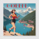 Vous courrez sur de hautes montagnes et faites des courses ultra-courantes à cause du café et du café seul. Ce superbe design montre un coureur dans les montagnes dans le style d'une affiche de voyage rétro vintage.