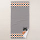 Cet adorable ensemble de serviettes de bain comprend un chat noir et blanc, assis à l'intérieur d'un citrouille sculpté. Sous le texte il y a un groupe blanc avec un motif citrouille noir et orange.