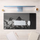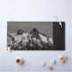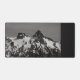 Une photo en noir et blanc de deux pics dans la Tatoosh Range connue sous le nom de Le Château et le Pinacle. La chaîne montagneuse est recouverte de neige malgré l'été. Il y a des arbres et des pierres éparpillés dans le paysage et les montagnes. La position du soleil permet de jeter des ombres sur la montagne. Les nuages d'incognito gracient le ciel. Copyright ©2023 Kimberly J Tilley. zazzle.com/store/developingnature