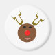 Cet aimant de Noël amusant présente une caricature amusante d'un Reindeer. Il a les yeux noirs et un énorme nez rouge vif et brillant. Les bois pointent vers le haut et semblent futuristes faisant de ce renne un cyber renne. Il est toujours mignon et amical.