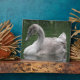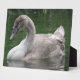 Cette magnifique plaque est ornée d'une photo d'un beau cygne. Le cygne est un oiseau juvénile, vous pouvez le constater par les plumes grises sur la tête et l'absence de bec orange. Le cygne glisse gracieusement à travers l'eau sur un lac calme.