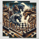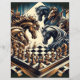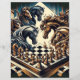 Le design dépeint une scène d'échecs fascinante et imaginative dans laquelle des chevaux aux manes impressionnantes et armures détaillées sont rassemblés sur un échiquier. Les chevaux semblent être stratégiquement impliqués dans le jeu d'échecs, créant un lien symbolique fort avec le chevalier dans le jeu d'échecs. Le style est un mélange de gravure vintage et d'illustration moderne avec des lignes dynamiques et une coloration spectaculaire dans les tons bleu, or et marron. Le design dégage une atmosphère mystique et stratégique, idéale pour les amateurs d'échecs et les amateurs d'imaginaires.