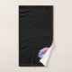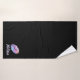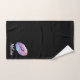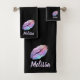 Les caractéristiques de conception ce un arrière - plan noir avec un baiser rose et bleu de rouge à lèvres avec votre nom ont imprimé au coin droit inférieur de chaque article dans l'ensemble de bain.