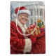 Trump habillé comme le Père Noël tient un grand sac rempli de cadeaux emballés devant une Maison Blanche enneigée. Le texte peut être modifié.