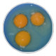 Ce bouton en céramique unique comporte les oeufs oranges profonds de poulet des poulets libres de gamme. Les jaunes oranges contre la cuvette bleue font une déclaration saisissante ! Copyright : Marjorie Tietjen
