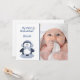 Célébrez le premier Hanoukka de bébé avec ce carte photo avec un mignon manchot habillé pour l'hiver en portant des bouffées d'oreilles et une écharpe bleues.