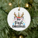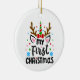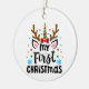 Un design adorable pour le premier Noël du bébé. Ce dessin dit "Mon premier Noël". Illustration de bois de licorne, de corne et d'oreilles. Nos ornements sont disponibles dans une variété de styles et de matériaux.