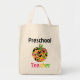 Un sac pour des professeurs comportant une conception d'une pomme couverte dans les éclaboussures jaunes, noires, vertes, et roses de peinture. Le texte assorti de spraypaint lit "le professeur préscolaire." Mettez en sac disponible dans d'autres couleurs et styles comprenant l'éléphant, l'impulsion, et les emballages de budget.