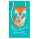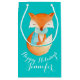 Personnalisez l'petit animal mignon de renard de sac de cadeau enveloppé vers le haut de chaud sur un arrière - plan de sarcelle d'hiver d'aqua. Personnalisez ce sac de fête saisonnier de cadeau d'art de renard avec votre choix de nom et de salutation. Lit actuellement bonnes fêtes Jennifer. Idéal pour vos cadeaux de Noël à la famille ou aux amis et des entreprises liées aux renards ou aux animaux. Ferait également la grande enveloppe pour vos animaux familiers et cadeaux de Noël. Renard lunatique mignon peint dans l'aquarelle et conçu par Sarah Trett.