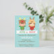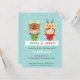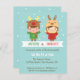 Soyez joyeux et lumineux avec cette invitation mignonne et gaie de fête de Noël ! Elle a un garçon et une fille qui portent les casquettes de renne et l'habillement mignons d'hiver qui incluent un chandail vert d'arbre de Noël et une écharpe rayée pour le garçon et une veste rouge pour la fille. Neige en baisse pour décorer l'arrière - plan. Personnalisez facilement avec vos détails de partie.