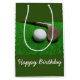 Sac d'anniversaire avec balle de golf sur herbe verte avec coin sable