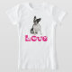 Ce tee - shirt canin amusant présente une image d'un chiot français Bulldog noir et blanc avec de l'amour imprimé en caractères gras de coeur rose.