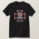 Ce tee - shirt a une croix noire de fer avec un visage de crâne avec un casque dessus. Le casque a une couleur grise ombragée avec des accents rouges.
