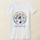 Le T-shirt de la femme avec le logo de l'église unitarienne Pacifique entouré par le cercle d'arc-en-ciel et 8 symboles religieux importants de partout dans le monde.