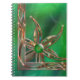 Une oeuvre abstraite en vert vif et en cuivre. Un bijou vert clair est entouré de lames d'herbe bordées de cuivre, agrémentées d'émeraudes étincelantes et d'étoiles oranges. Les fractales ondulantes et courbes de l'arrière - plan apparaissent en vert, marron et orange plus profond à l'intérieur du fil de cuivre du motif de la feuille.