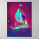 Un bateau solitaire naviguant sur l'océan ouvert, l'art nous beaucoup de bleu, violet et un peu de rose dans la coloration. C'est un art généré par l'IA.