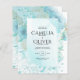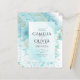 Joli verre de mer aqua bleu turquoise fleurs avec feuilles or figurent sur cette invitation de mariage moderne et élégante.