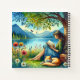 Joli aquarelle d'art représentant une femme assise sous un arbre se reposant au bord d'un lac et les montagnes lisant un livre avec un chat endormi faisant la sieste à côté des jolies fleurs capricieuses.