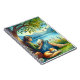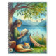 Joli aquarelle d'art représentant une femme assise sous un arbre se reposant au bord d'un lac et les montagnes lisant un livre avec un chat endormi faisant la sieste à côté des jolies fleurs capricieuses.