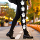 Apportez une attention ludique à chaque tenue! Ces jambières noires ont une rangée de cinq fantômes adorables sur le côté, chacun avec une expression différente mignonne et des petits bras levés, essayant de faire de leur mieux pour être éffrayants. Parfait pour tous ceux qui aiment le plaisir, style Halloween fantaisiste.