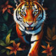 “Tiger of Mine” – Colourful Tiger Portrait. A fierce yet intimate portrait of nature’s majesty, “Tiger of Mine” places the viewer face-to-face with a creature both sacred and untamed. Rich tropical foliage in jewel-toned hues surround the watchful predator, evoking the beauty and power of the jungle as a realm of silent intensity and deep emotion.