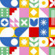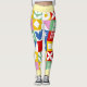 These leggings burst with playful, modern energy thanks to their bold patchwork design. Each square and rectangle features its own vibrant motif—tulip-like florals, diamonds, stars, circles, and stylized leaves—creating a lively mosaic of color and pattern. The palette mixes saturated reds, yellows, greens, blues, pinks, and crisp white, giving the piece a cheerful, retro‑meets‑modern vibe.