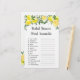 Ces adorables Cartes de jeu Bridal Word Scramble sont une excellente façon de commencer à s'amuser à votre Fête des mariées et garanti être un grand succès! Il vous suffit de les faire circuler pendant la Fête des mariées où vous vous amuserez à démêler les 15 mots liés aux mariages ! La première personne avec les bonnes réponses gagne ! La clé de réponse est incluse au verso. La décoration est composée de citrons d'aquarelle aux couleurs vives, de plantes vertes et de plaques de feuilles d'or.