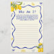 Ajoutez un peu de plaisir à votre thème principal de douche nuptiale avec ce jeu personnalisé Guess Who! Doté d'une charmante décoration citron, ce jeu est parfait pour une fête de citron de douche à la nuptiale. C’est un grand ajout au thème de la douche au citron nuptiale, qui apporte des rires et des souvenirs à votre événement. Idéal pour ceux qui recherchent des idées de douches nuptiales à thème citron et des idées de douches nuptiales à thème citron italien, ce jeu est un must pour les idées de douches nuptiales d'été.