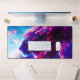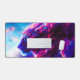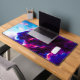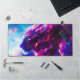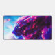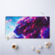 Un puissant léopard cosmique émergeant de nuages vibrants de rose néon, de bleu électrique et de violet profond.