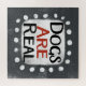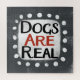 "Dogs Are Real" est un design de texte mignon en gris avec du texte en noir et rouge, avec une forme d'accent blanc et des points blancs à texture blanche.