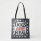 "Dogs Are Real" est un design de texte mignon en gris avec du texte en noir et rouge, avec une forme d'accent blanc et des points blancs à texture blanche.