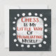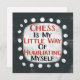 Un design typographique irrévérencieux qui dit "Les échecs, c'est ma petite façon de m'humilier". Il présente du texte noir et rouge sur un rectangle blanc avec des points blancs amusants et amusants qui l'entourent, le tout sur un arrière - plan gris foncé.