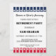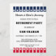 Célébrez la retraite honorable d'un soldat avec ces invitations patriotiques à la retraite militaire. Dotées d'un emblématique drapeau américain en rouge, blanc et bleu vif, ces cartes sont une façon parfaite d'honorer leurs années de service. Customisez la conception avec le nom, le rang et la branche de service du retraité pour créer un gardien vraiment personnalisé. Parfait pour toute fête ou événement militaire de retraite.