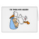 Le T-shirts jumeau adorable de conception, les tasses, les sacs fourre-tout, les boutons, et d'autres articles jumeaux comportant une cigogne portant une couverture bleue avec deux bébés et textes de sourire qui lit "les jumeaux sont arrivés !".