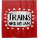 "Trains Are My Jam" est un design de texte amusant avec une forme d'accent blanc entourée de points blancs texturés.