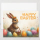 Un mignon lapin de Pâques avec une couronne de fleurs se trouve affectueusement au milieu des oeufs colorés de Pâques. Il tient un petit panier en osier avec des oeufs peints dans ses pattes. La scène est entourée de fleurs printanières délicates et de lumière chaude. L'inscription "Bonne Pâques" brille au-dessus du lapin en orange joyeuse - un accueil chaleureux qui capture la légèreté et la joie de la fête du printemps.