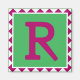 La lettre majuscule 'R' est faite dans une couleur fuchsia sur un arrière - plan vert vif. La bordure prend sur la couleur fuchsia de la lettre et a un design en forme de losange tout autour du bord en fuchsia et blanc.