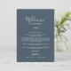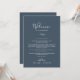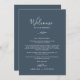 Ces cartes d'accueil et d'itinéraire minimes en ardoise bleue sont parfaites pour un mariage élégant. Le design se compose d'une simple silhouette verte dans un bleu gris foncé avec un style minimaliste classique. Le recto de la carte comporte une lettre de bienvenue et le verso de la carte indique l'itinéraire du mariage. Ces notes sont parfaites pour les mariages de destination et les sacs de bienvenue des clients de l'hôtel.