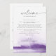 Ces cartes d'accueil et d'itinéraires en prune d'aquarelle moderne sont parfaites pour un mariage contemporain élégant. La collection design minimaliste, classique et élégante présente de simples touches de peinture couleur à l'eau dans de jolis tons bijoux. Le recto de la carte comporte une lettre de bienvenue et le verso de la carte indique l'itinéraire du mariage. Ces notes sont parfaites pour les mariages de destination et les sacs de bienvenue des clients de l'hôtel.